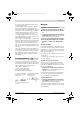 OBJ_BUCH-1352-001.book Page 10 Thursday, November 11, 2010 3:54 PM 10 | Deutsch Staub-/Späneabsaugung f Stäube von Materialien wie bleihaltigem Anstrich, einigen Holzarten, Mineralien und Metall können gesundheitsschädlich sein. Berühren oder Einatmen der Stäube können allergische Reaktionen und/oder Atemwegserkrankungen des Benutzers oder in der Nähe befindlicher Personen hervorrufen.