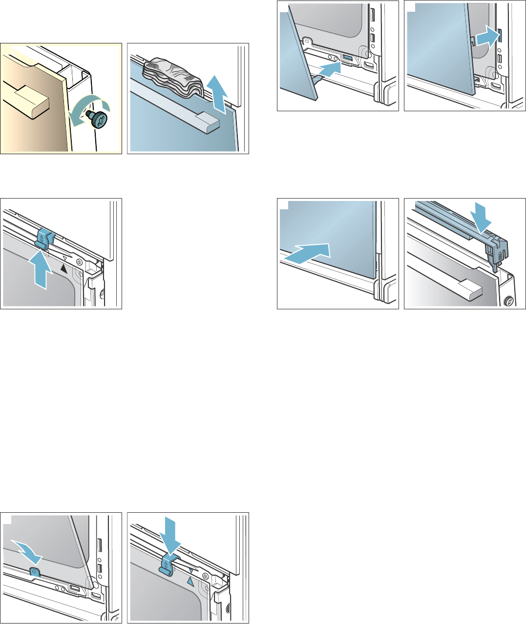 - 6. Trykk de to holderne oppe på den midterste ruten oppover, ikke ta dem av (bilde %). Hold fast ruten med en hånd. Ta ut glassruten.