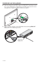 Installeren van het systeem D. Druk op de aan-uitknop op de bedieningsconsole om het systeem aan te zetten. Doordat het systeem in energiebesparingsmodus staat wanneer het op stand-by staat, duurt het een paar seconden voordat het opstart. Wanneer de statusindicator van het systeem verandert van knipperend in continu groen is het systeem klaar voor gebruik. Statusindicator Aan-uitknop E. Zet de tv aan. F.