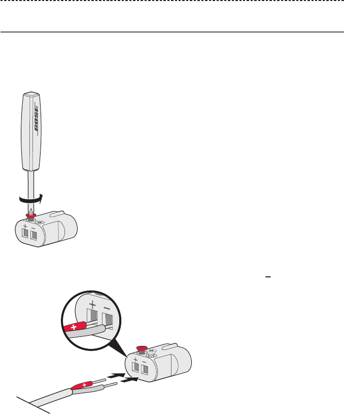 2. Insert the red, stripped end of the two-pin cable marked + into the red + terminal.