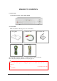 PRODUCT CONTENTS ● SYSTEM UNIT 4 CHANNEL DIGITAL VIDEO RECORDER ● ACCESSORIES Make sure that the following accessories are included. ① User guide ② Camera Cable ④ Signal Ground Cable ⑤ USB Cable ③ Software CD In case that the product is defective or damaged, please contact your dealer. Please keep the packaging materials for transport purposes. WARNING • Don’t turn off the power or unplug the power cord while hard disk drive is in operation.