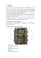 2. Anleitung Vielen Dank für den Kauf der BRAUN Scouting-Kamera BLACK400phone. Diese Kamera ist eine automatische Überwachungskamera. Sie wird durch Bewegungen von Menschen (oder Tieren) in einem bestimmten, zu überwachenden Bereich (ROI) über einen hochempfindlichen passiven Infrarot-Bewegungssensor (PIR) ausgelöst und nimmt dann automatisch qualitativ hochwertige Bilder (bis zu 12 MP) oder zeichnet 1080p HD-Videoclips (WVGA oder QVGA) auf.
