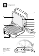 A. Poignée en acier inoxydable Avec bras en métal moulé. B. Plaques réversibles antiadhésives en céramique Plaques réversibles recouvertes de céramique Fusion HR pour cuisson sans huile et nettoyage facile. Sans APFO et PTFE. C. Bouton de dégagement de la plaque supérieure Ce bouton retire la plaque supérieure. Retirez indépendamment les plaques supérieure et inférieure pour les interchanger ou pour faciliter le nettoyage. D. Dégagement du verrouillage pour mode BBQ E.