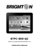 DECLARATION OF CONFORMITY I.R.P., SL declare under our responsibility that the equipment meets the requirements indicated in the following directives: EMC DIRECTIVES EN60950-1:2006/A11:2009/A1:2010 EN 62311: 2088 EN 301 489-1 V1.9.2:2011-09 EN 301 489-17 V2.1.1:2009-05 EN 300 328 V1.7.1: 2006-10 ETSI EN 301 489-1 V1.9.2(2011-09) ETSI EN 301 489-17 V2.1.1(2009-05) Description of apparatus: BRIGMTON Model BTPC-800-QC Movile Internet Device Importer: I.R.P.