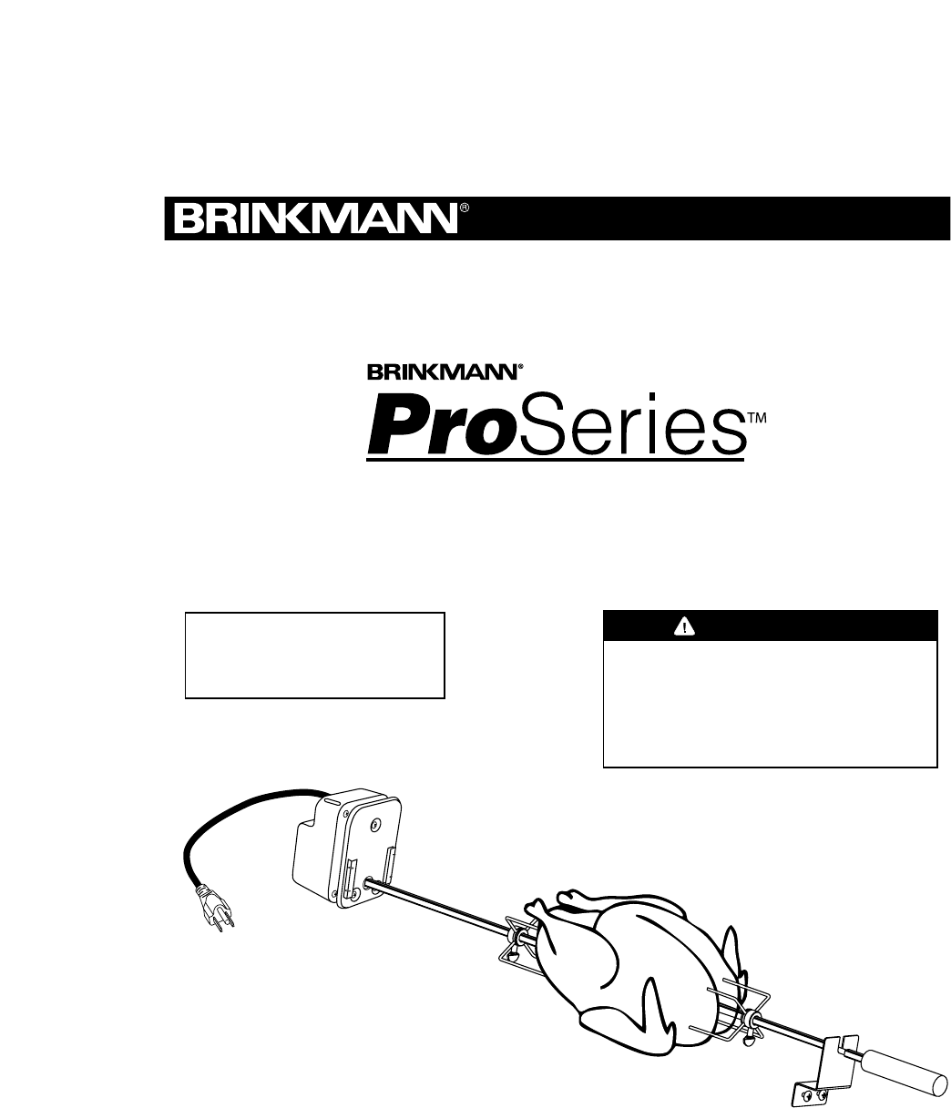 ©2003 The Brinkmann Corporation Dallas, Texas 75244 U.S.A www.brinkmanncorp.com ONE-YEAR LIMITED WARRANTY For one-year from date of purchase, The Brinkmann Corporation warrants the Brinkmann ProSeriesTM Rotisserie against defects due to workmanship or materials to the original purchaser.