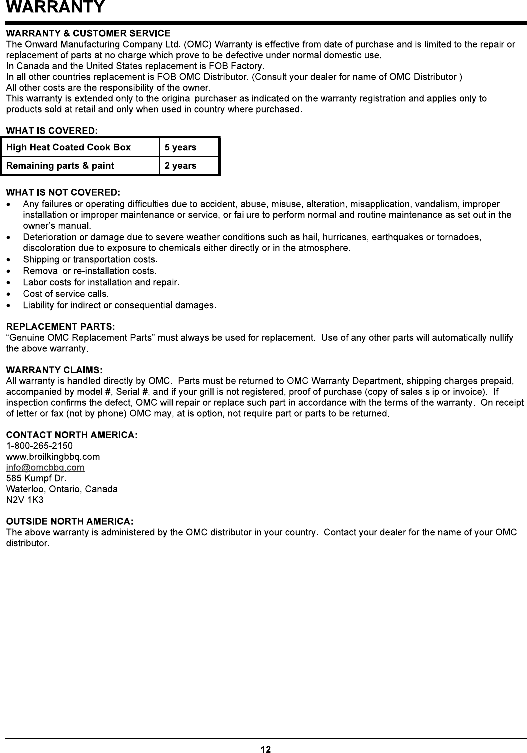WARRANTY WARRANTY & CUSTOMER SERVICE The Onward Manufacturing Company Ltd. (OMC) Warranty is effective from date of purchase and is limited to the repair or replacement of pairs at no charge which prove to be defective under normal domestic use. In Canada and the United States replacement is FOB Factory. In all other countries replacement is FOB OMC Distributor. (Consult your dealer for name of OMC Distributor.) All other costs are the response of the owner.