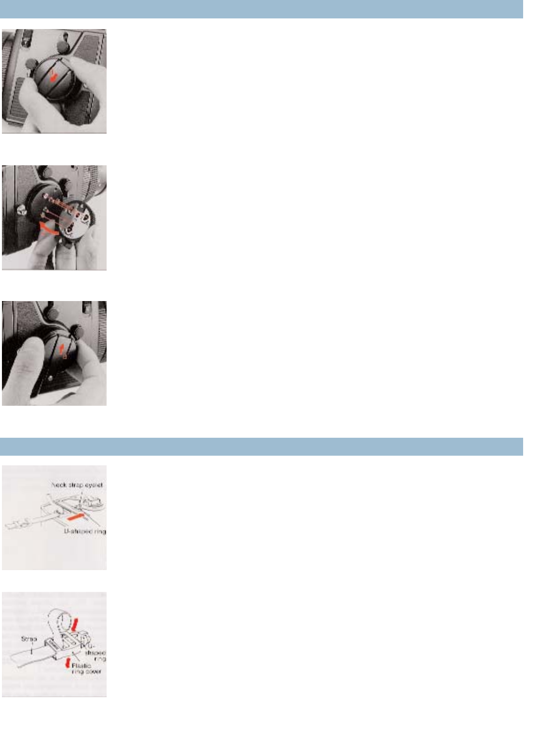 A. First, insert the U-shaped ring into the neck strap eyelet, as illus-