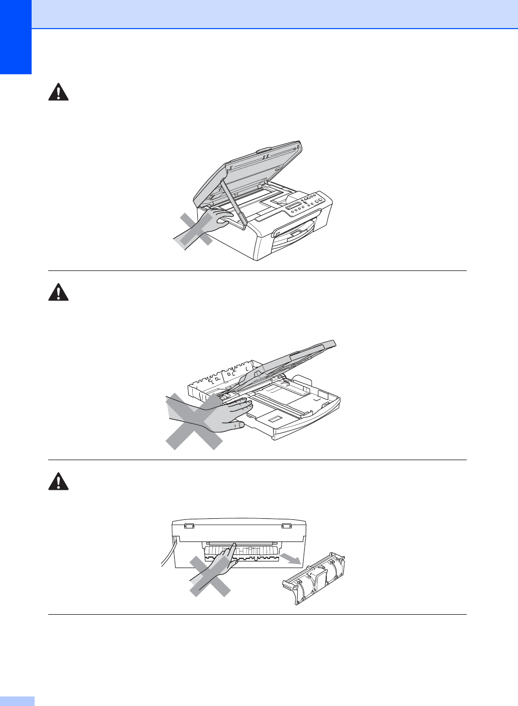 Plaats uw handen NIET op de rand van de machine onder het scannerdeksel. Hierdoor kunt u