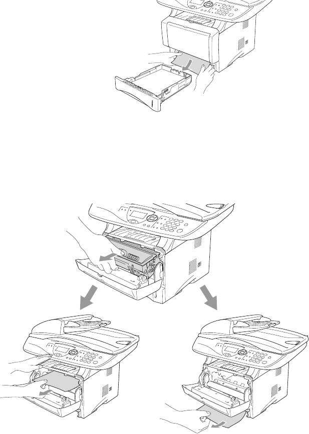 Pull out the drum unit assembly. Pull the jammed paper up and