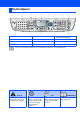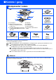 ■ Komme i gang Komponenter i esken 8 MFC 1 7 Hurtigoppsettguide 2 3 6 5 4 CD-plater 4. Papirbrett 5. Frontdeksel utvidelse) for dokumenter med 6. Strømbryter 7. Dokumentdeksel forsiden ned 3. (For MFC-8440) Manuelt matebrett 8. Automatisk dokumentmater 1. Kontrollpanel 2.