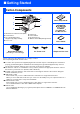 ■ Getting Started Carton Components 1 2 8 7 3 4 6 5 1. Automatic Document Feeder (ADF) 2. Control Panel 3. Face-down Output Tray Support Flap (Support Flap) CD-ROMs For Windows® For Macintosh® 5. Paper Tray 6. Power Switch 7. Document Cover 8. ADF Document Output Support Flap 4. Front cover Drum Unit Assembly (including Toner Cartridge) Quick Setup Guide User’s Guide AC Power Cord Telephone Line Cord Carton components may differ from one country to another.