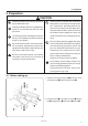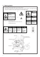 3. Preparation 3-4. Connecting the ground wire DANGER Be sure to connect the ground. If the ground connection is not secure, you run the risk of receiving a serious electric shock. Connection method for 3-phase power supply Red White 3-phase power supply Black Yellow/Green ......... Connect to ground 3-5. V-belt tension These should approximately 10 - 12 mm of slack when Vbelt is loaded at 9.8 N (1 kgf). To adjust, loosen the two nuts q, and shift the motor up or down. 9.8 N 10 - 12 mm 3-6.
