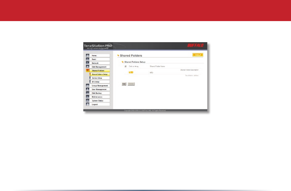To add new shares to your TeraStation, select Shared Folders from the left side menu, and then