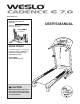 BEFORE YOU BEGIN Thank you for selecting the new WESLO® CADENCE G 7.0 treadmill. The CADENCE G 7.0 treadmill offers a selection of features designed to make your workouts at home more effective. And when youʼre not exercising, the unique treadmill can be folded up, requiring less than half the floor space of other treadmills. ing this manual, please see the front cover of this manual. To help us assist you, note the product model number and serial number before contacting us.