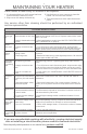 MAINTAINING YOUR HEATER Clean heater at least every 24 months or as required. 1. It is important that you verify power has been turned off and the element is cool. 2. Wipe cover with damp cloth and dry. 3. Use the hose on your vacuum to clean the heater. Do not touch the element. 4. Turn power back on at the main disconnect panel. ny service other than cleaning should be performed by an authorized A service representative. TROUBLESHOOTING Symptom Problem Solution 1.