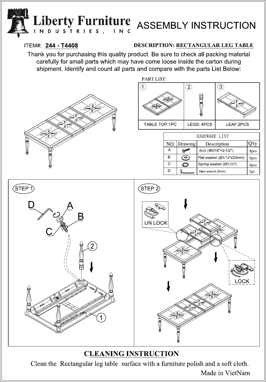 E Liberty Furniture employ's INSTRUCTION INDUSTRIES, INC ITEM#: 244 T4408 DESCRIPTION: RECTANGULAR LEG TABLE Thank you for purchasing this quality product. Be sure to check all packing material carefully for small parts which may have come loose inside the carton during shipment. Identify and count all parts and compare with the parts List Below: @ PART LIST: LEGS: PCS LEAFLESS HARDWARE LIST 0.