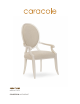 DIMENSIONS: 23.5W x 27D x 42.5H This dressy arm chair has an exposed wood frame that is finished in Soft Silver Paint. It surrounds an oval upholstered back and tight seat that are covered in a shimmering brushed tweed fabric in neutral tones. Tapered sabre legs enhance its classic appeal.