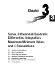 Chapter 3 Solve, Differential/Quadratic Differential, Integration, Maximum/Minimum Value, and Σ Calculations 3-1 3-2 3-3 3-4 3-5 3-6 3-7 Function Analysis Menu Solve Calculations Differential Calculations Quadratic Differential Calculations Integration Calculations Maximum/Minimum Value Calculations Σ Calculations