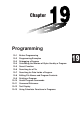 Chapter Programming 19-1 19-2 19-3 19-4 19-5 19-6 19-7 19-8 19-9 19-10 19-11 19-12 19-13 Before Programming Programming Examples Debugging a Program Calculating the Number of Bytes Used by a Program Secret Function Searching for a File Searching for Data Inside a Program Editing File Names and Program Contents Deleting a Program Useful Program Commands Command Reference Text Display Using Calculator Functions in Programs 19