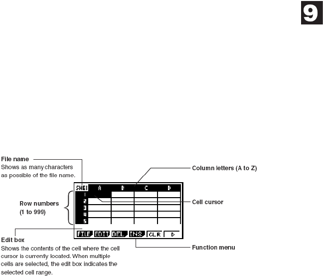 Выбор S • SHT из главного меню отображает экран электронной таблицы. Вход в режим S •