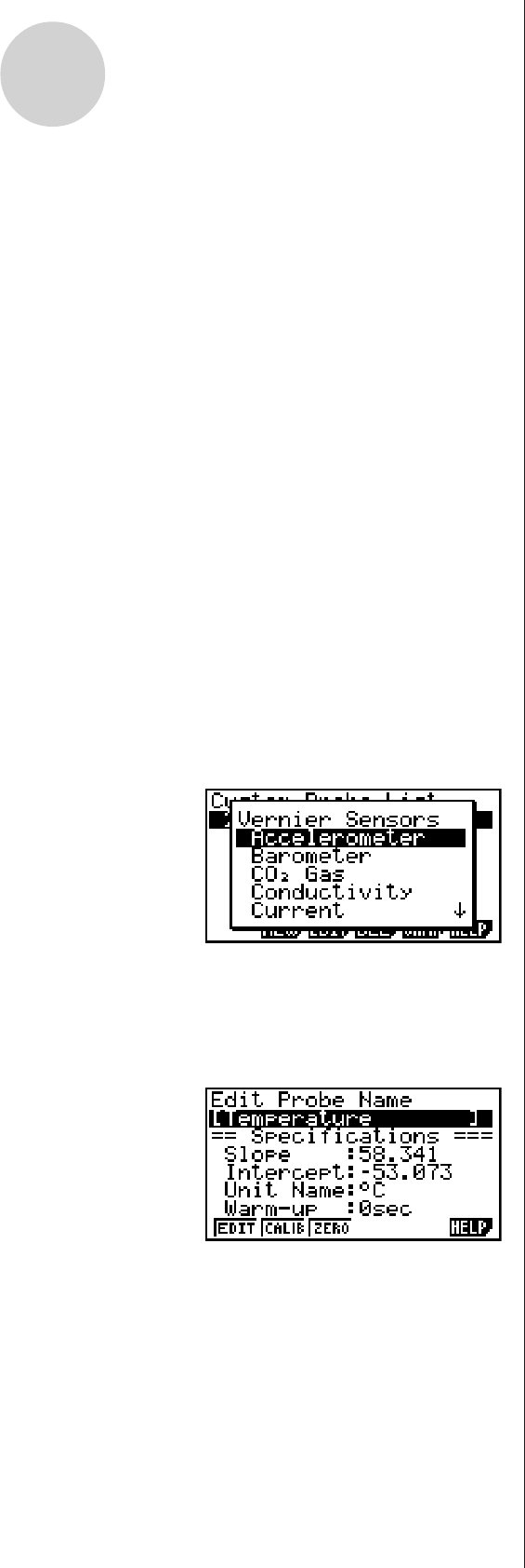 • The name and specifications of the Vernier sensor you select will appear on the custom