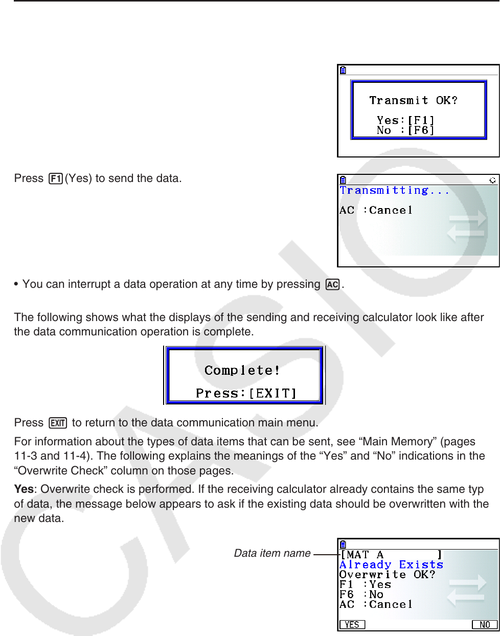 After selecting the data items to send, press 6(TRANSMIT). A message appears to confirm