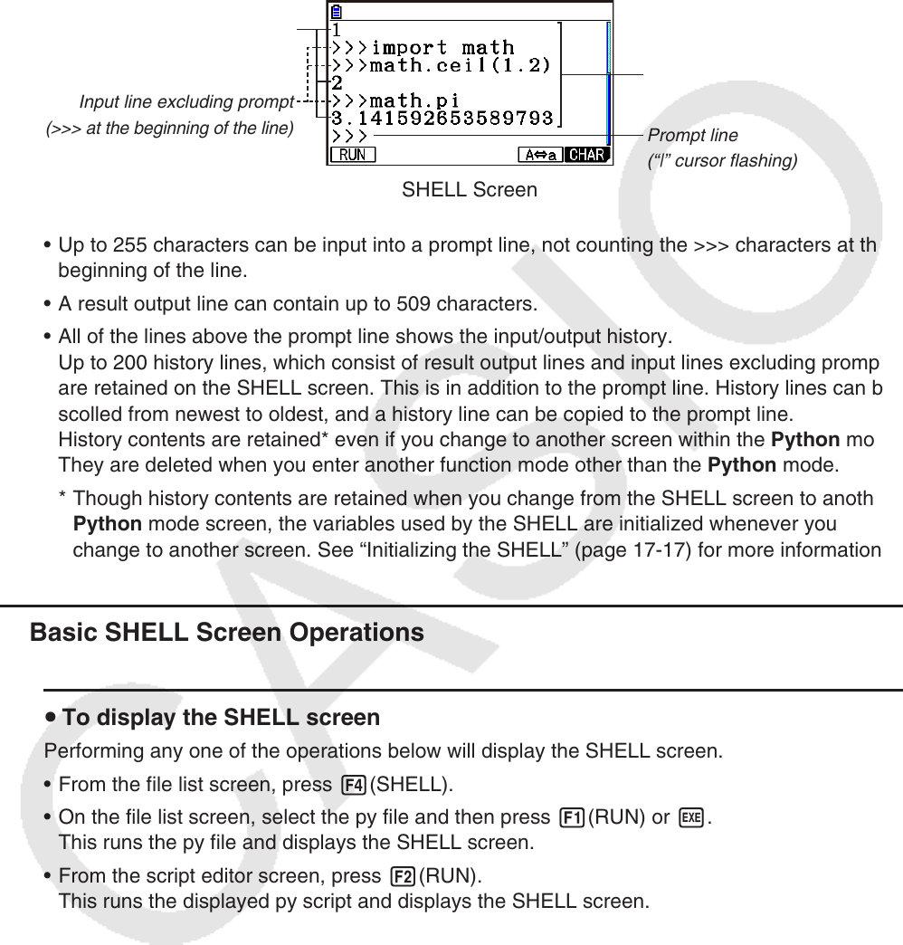 are retained on the SHELL screen. This is in addition to the prompt line. History lines can be