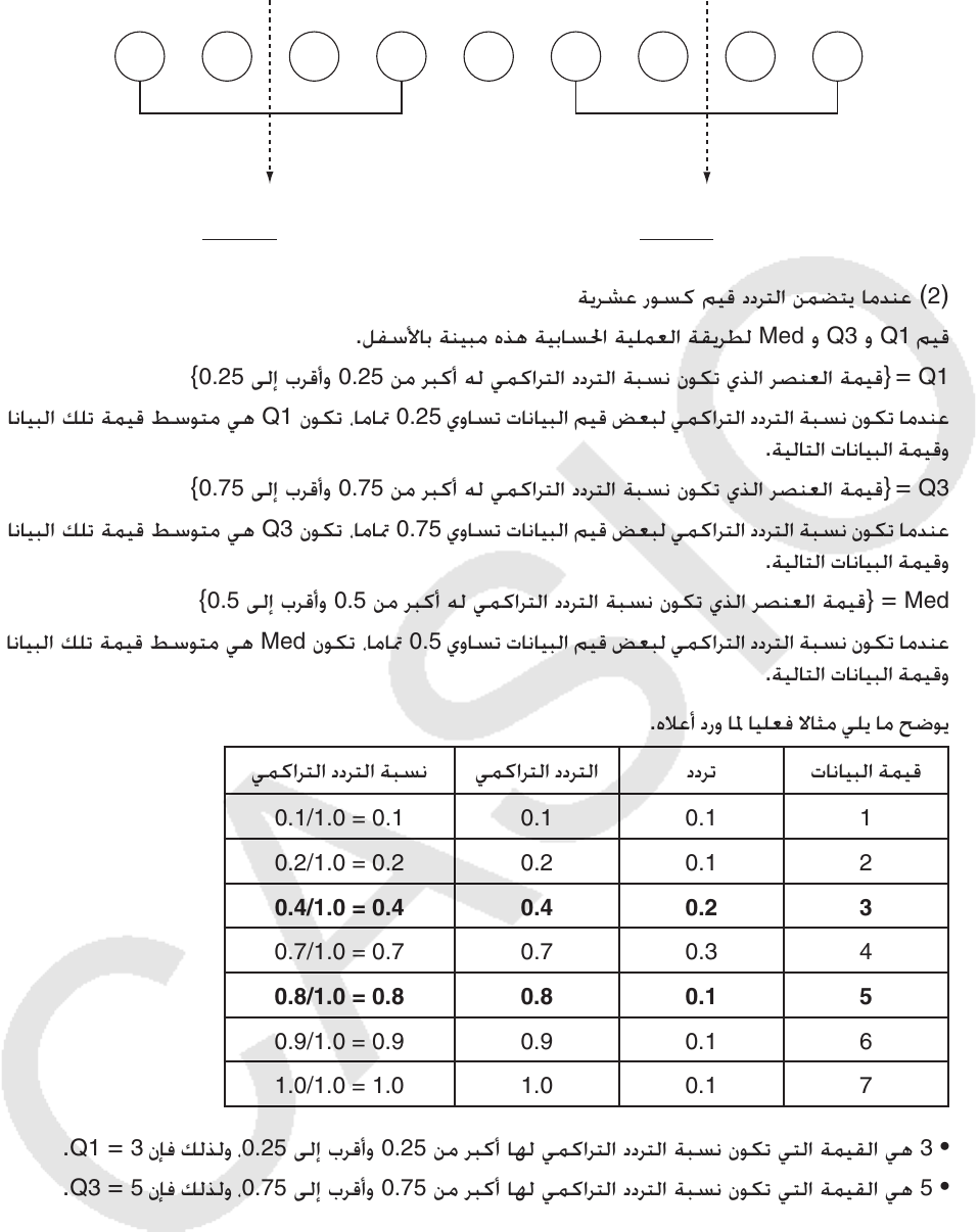Q3 = 5 ﻥﺈﻓ ﻚﻟﺬﻟﻭ ،0.75 ﻰﻟﺇ ﺏﺮﻗﺃﻭ 0.75 ﻦﻣ ﺮﺒﻛﺃ ﺎﻬﻟ ﻲﻤﻛﺍﺮﺘﻟﺍ ﺩﺩﺮﺘﻟﺍ ﺔﺒﺴﻧ ﻥﻮﻜﺗ ﻲﺘﻟﺍ ﺔﻤﻴﻘﻟﺍ ﻲﻫ 5 •