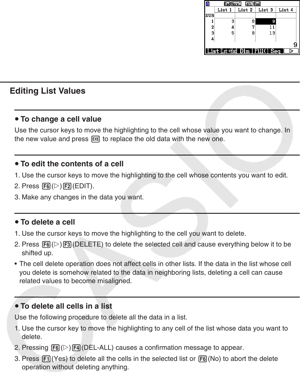 3. Press 1(Yes) to delete all the cells in the selected list or 6(No) to abort the delete