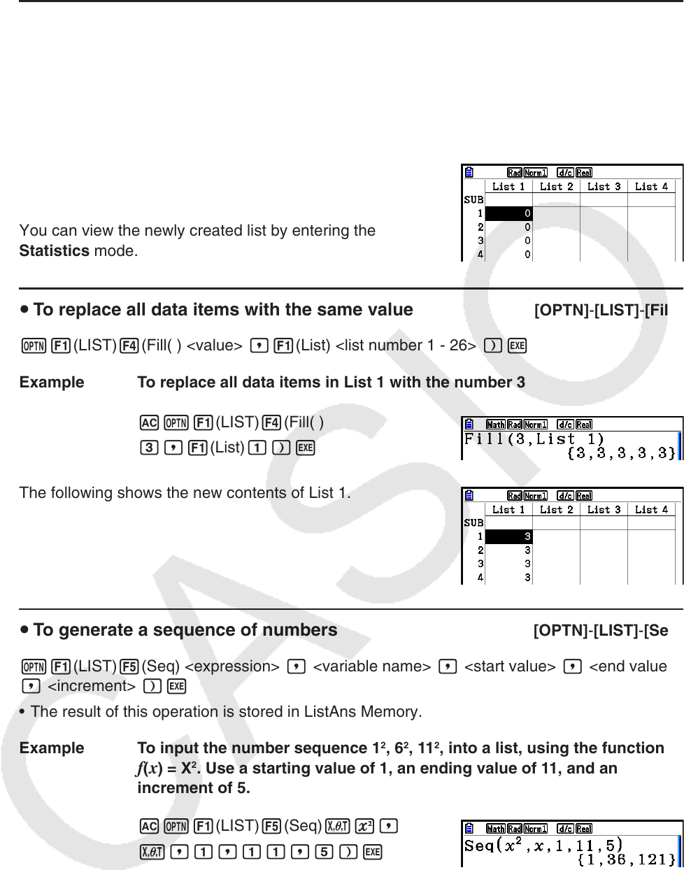 u To replace all data items with the same value [OPTN] - [LIST] - [Fill(]