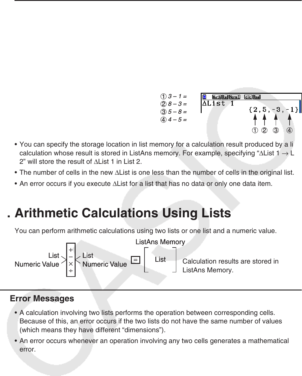 calculation whose result is stored in ListAns memory. For example, specifying “ ΔList 1 → List