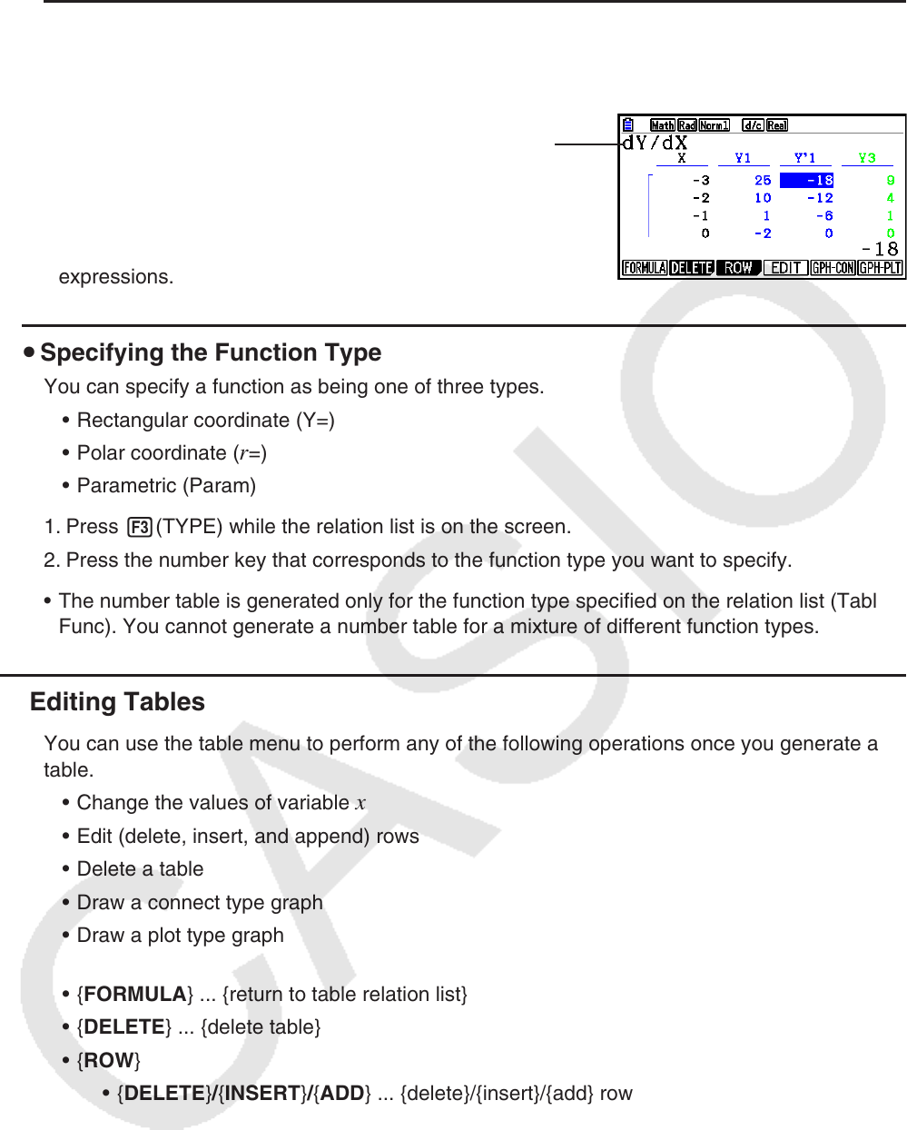 Changing the setting of Setup screen’s “Derivative” item to “On” causes a number table that