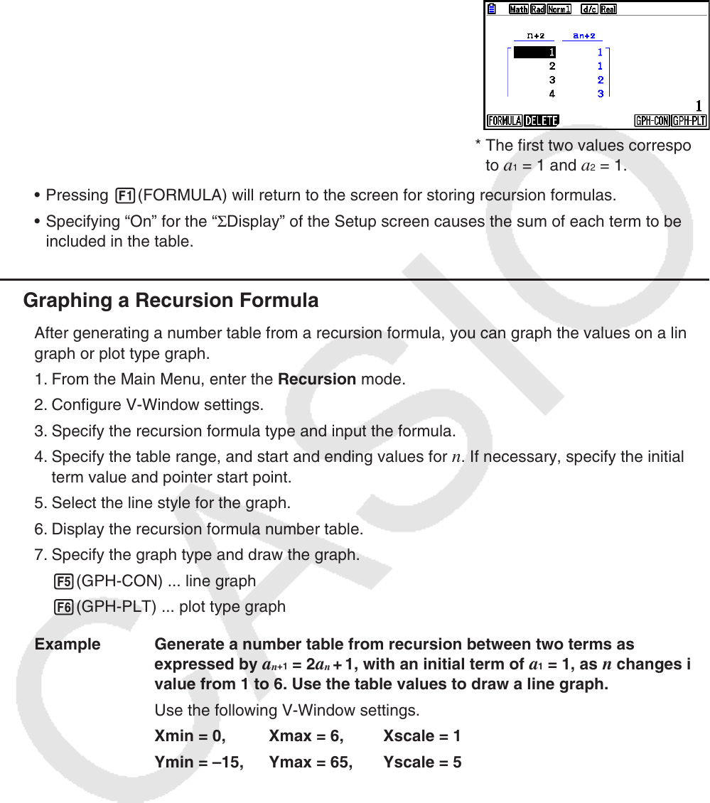 • Pressing 1(FORMULA) will return to the screen for storing recursion formulas.