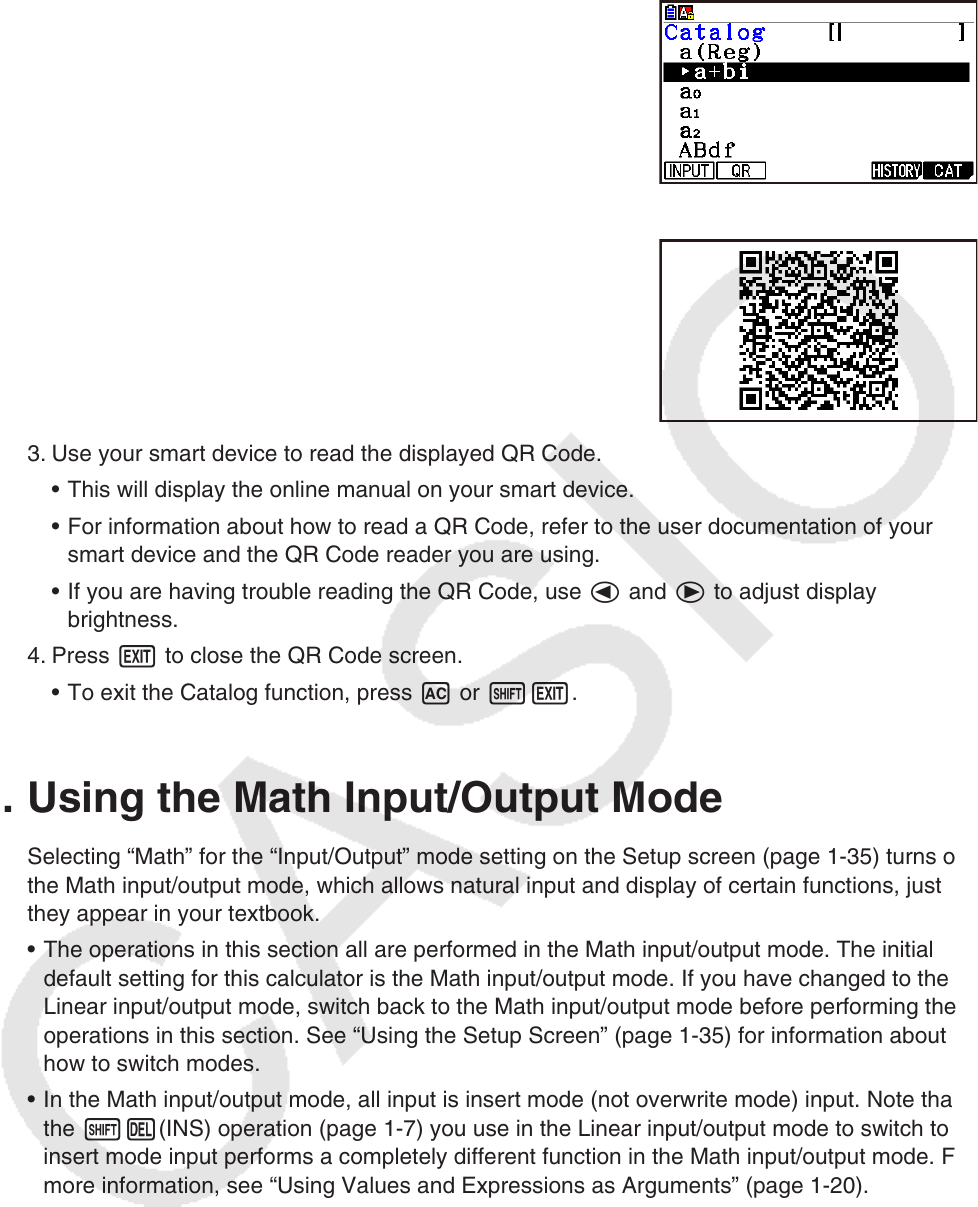 • In the Math input/output mode, all input is insert mode (not overwrite mode) input. Note that