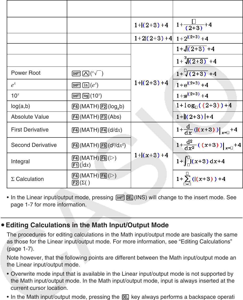 The procedures for editing calculations in the Math input/output mode are basically the same