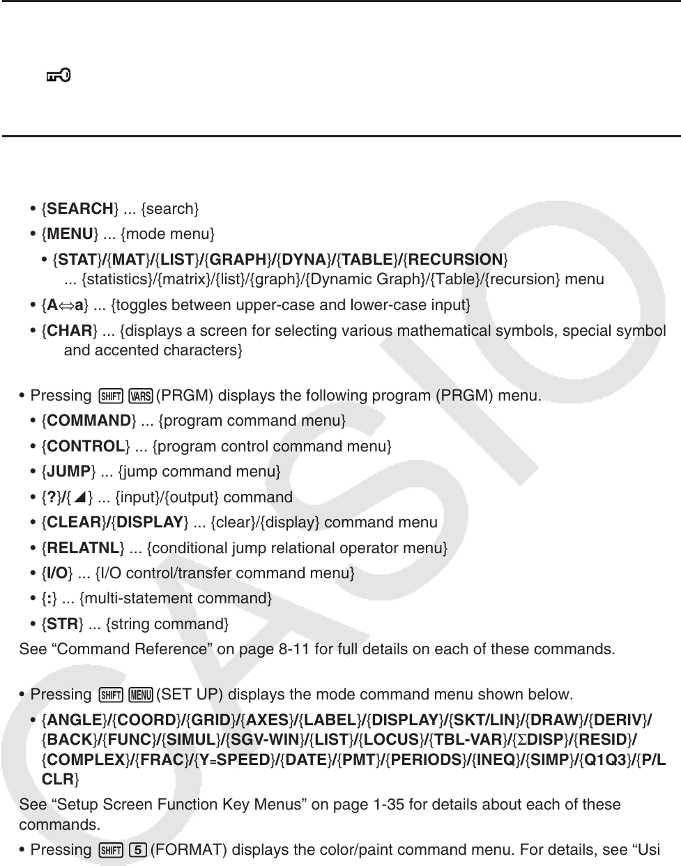 • { CHAR } ... {displays a screen for selecting various mathematical symbols, special symbols,