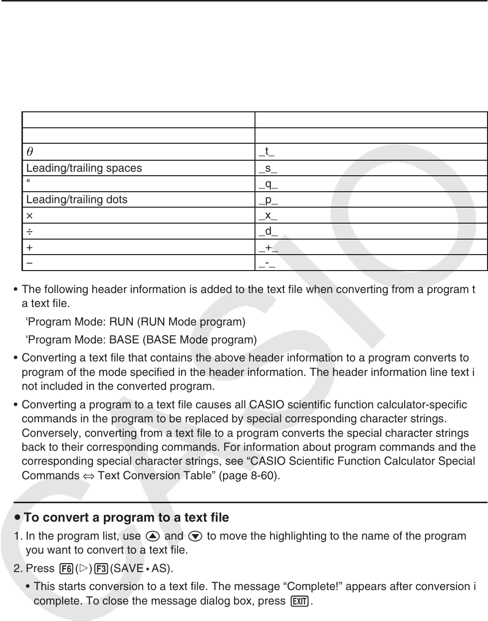 • Converting a program to a text file causes all CASIO scientific function calculator-specific