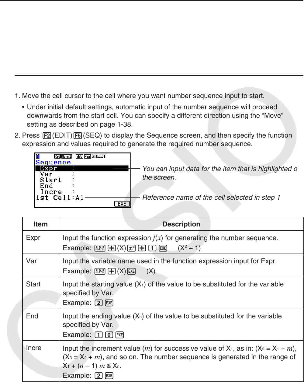 2. Press 2(EDIT) 5(SEQ) to display the Sequence screen, and then specify the function