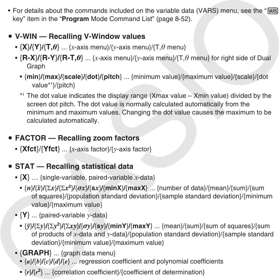 • For details about the commands included on the variable data (VARS) menu, see the “J