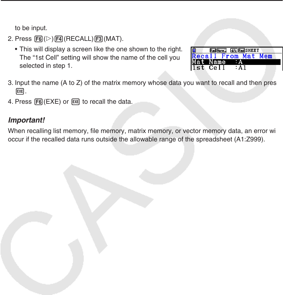 • When data is recalled to a spreadsheet from matrix memory or vector memory, the text color,