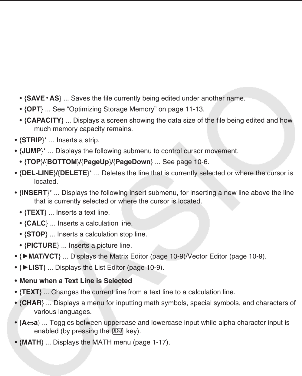 • { CHAR } ... Displays a menu for inputting math symbols, special symbols, and characters of