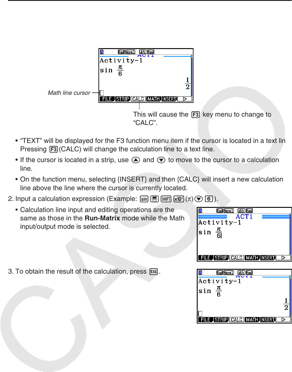 • While the cursor is in a calculation line, “CALC” will be displayed for the F3 function menu