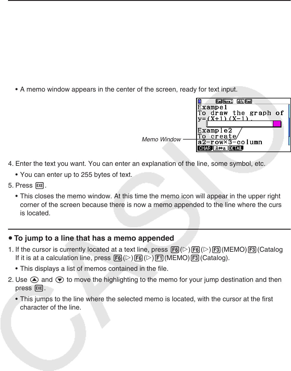 1. If the cursor is currently located at a text line, press 6(g)6(g)3(MEMO)3(Catalog).