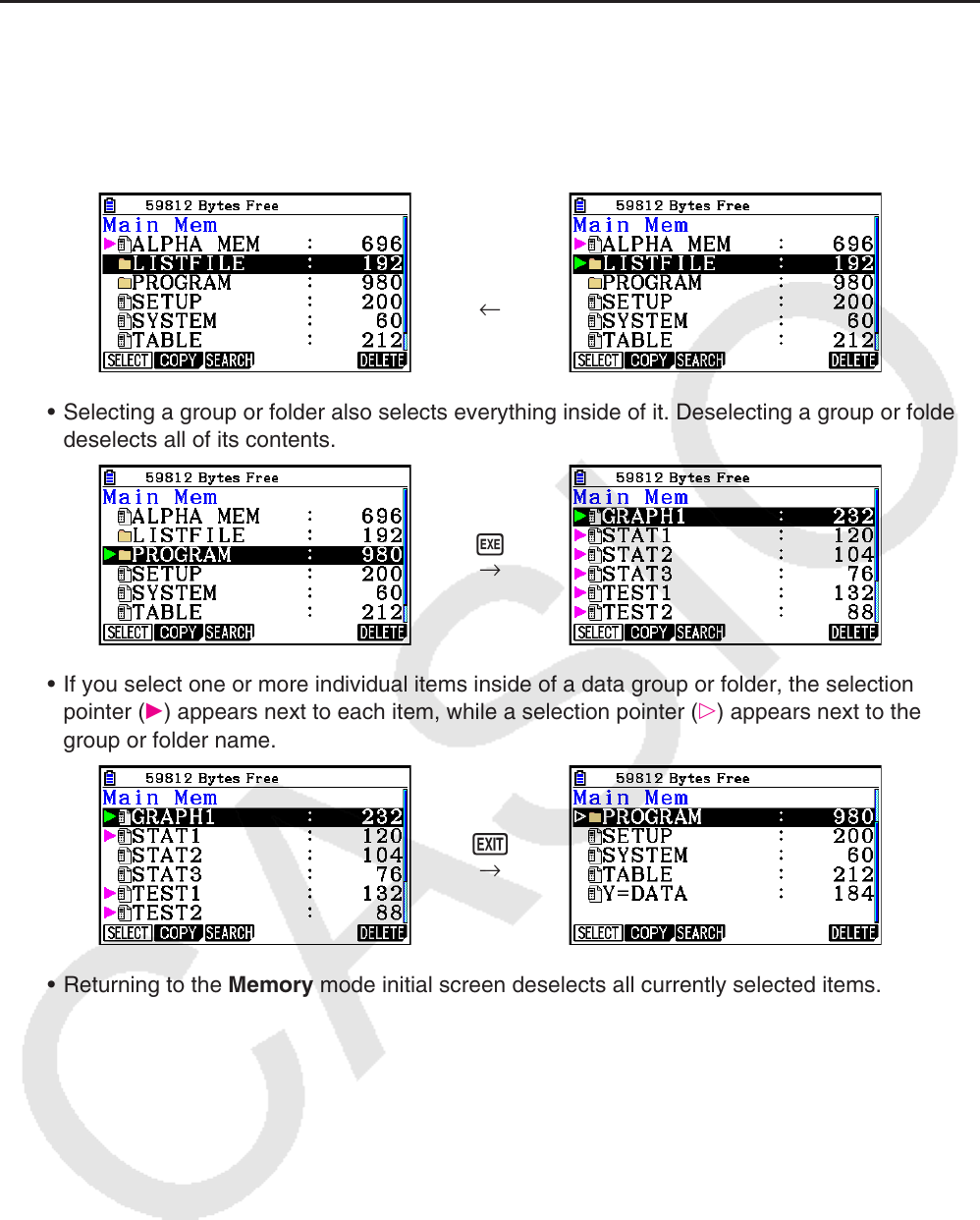 • Returning to the Memory mode initial screen deselects all currently selected items.