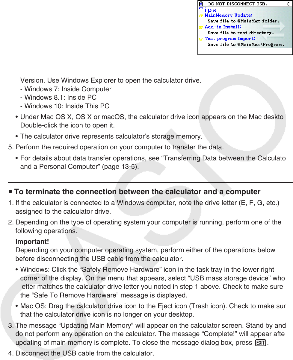 • Mac OS: Drag the calculator drive icon to the Eject icon (Trash icon). Check to make sure