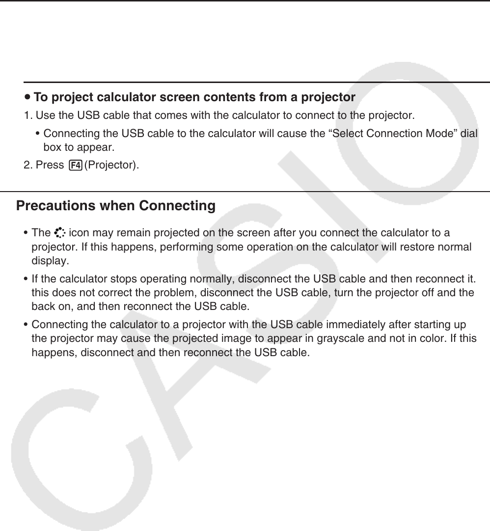 • Connecting the calculator to a projector with the USB cable immediately after starting up