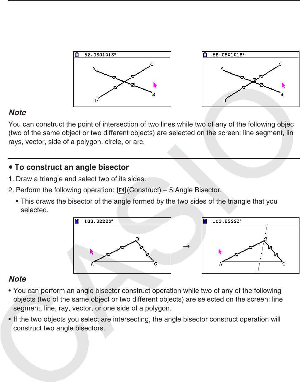 • If the two objects you select are intersecting, the angle bisector construct operation will