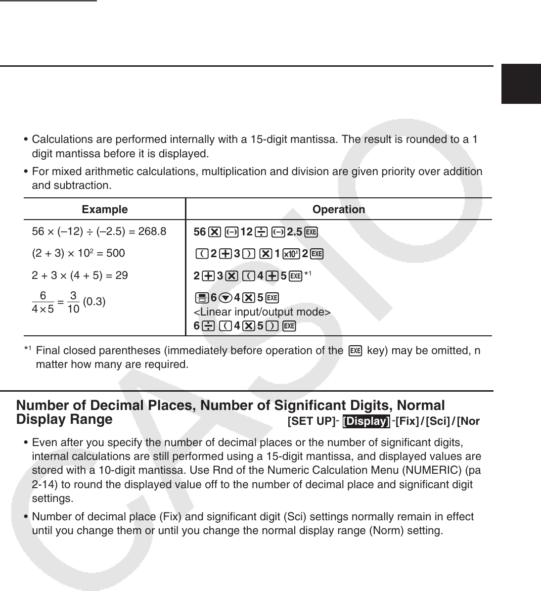 • Calculations are performed internally with a 15-digit mantissa. The result is rounded to a 10-