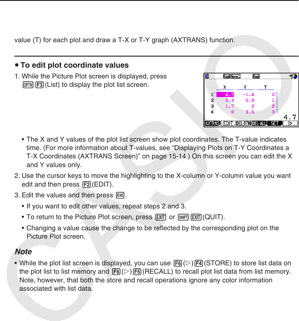 • The X and Y values of the plot list screen show plot coordinates. The T-value indicates