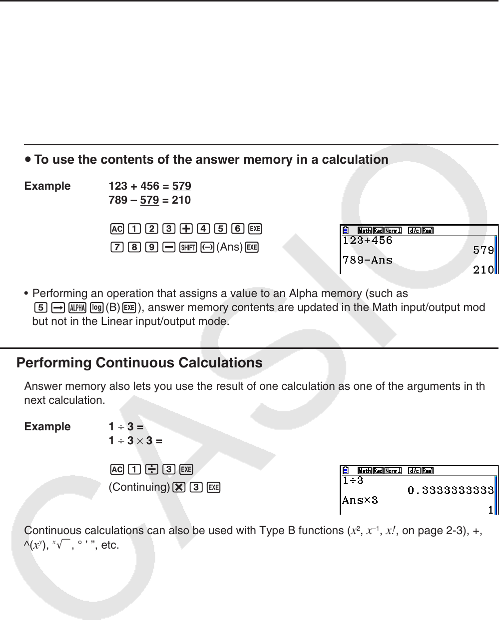• Answer memory contents are not cleared when you press the A key or when you switch